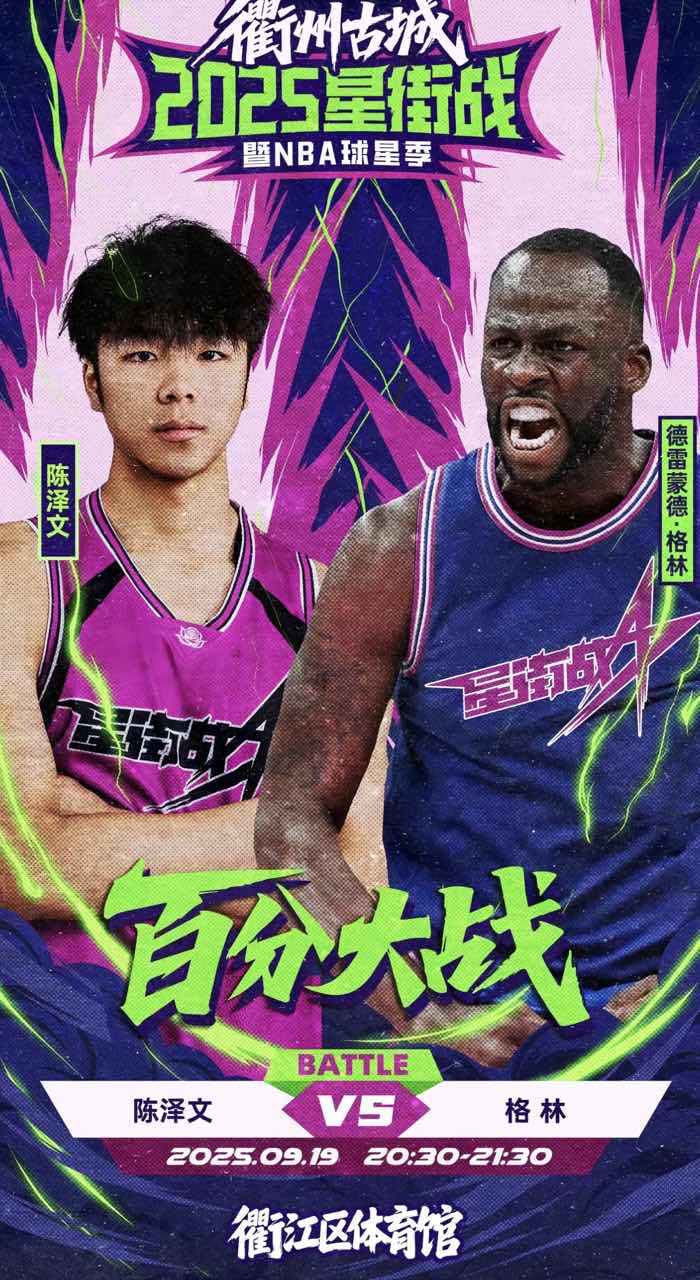 雷速体育9月6日讯 国内街球赛事主办方“星街战”今日更新社媒,正式官宣了勇士球星追梦格林的百分大战,他的对手是国内街球手陈泽文,比赛将于9月19日晚上20:30至21:30举行。