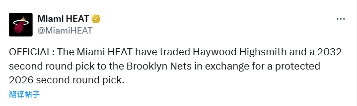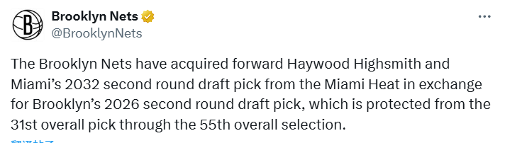 2换1交易官宣!热火送出海史密斯+32年次轮 从篮网换来26年次轮