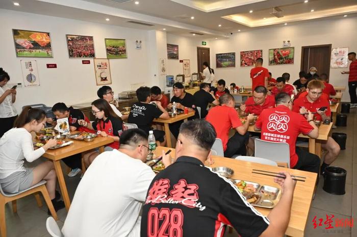 今天上午,有数十名球迷协会代表走进基地,沉浸式感受了蓉城球员全力备战的训练日常。他们不仅体验了职业球员同款营养餐,还与成都蓉城主教练徐正源、球员们近距离交流互动,定格了许多美好瞬间。活动中,成都蓉城助理教练甘锐带领大家参观了平时难得一见的球员休息区、食堂、球队大巴等区域。在健身房,甘锐化身“健身达人”,详细讲解了器械的使用方法,并且传授了自己在运动生涯中的身体管理经验,球迷们通过他的讲述了解到不少球员之间相处以及训练中的趣事。